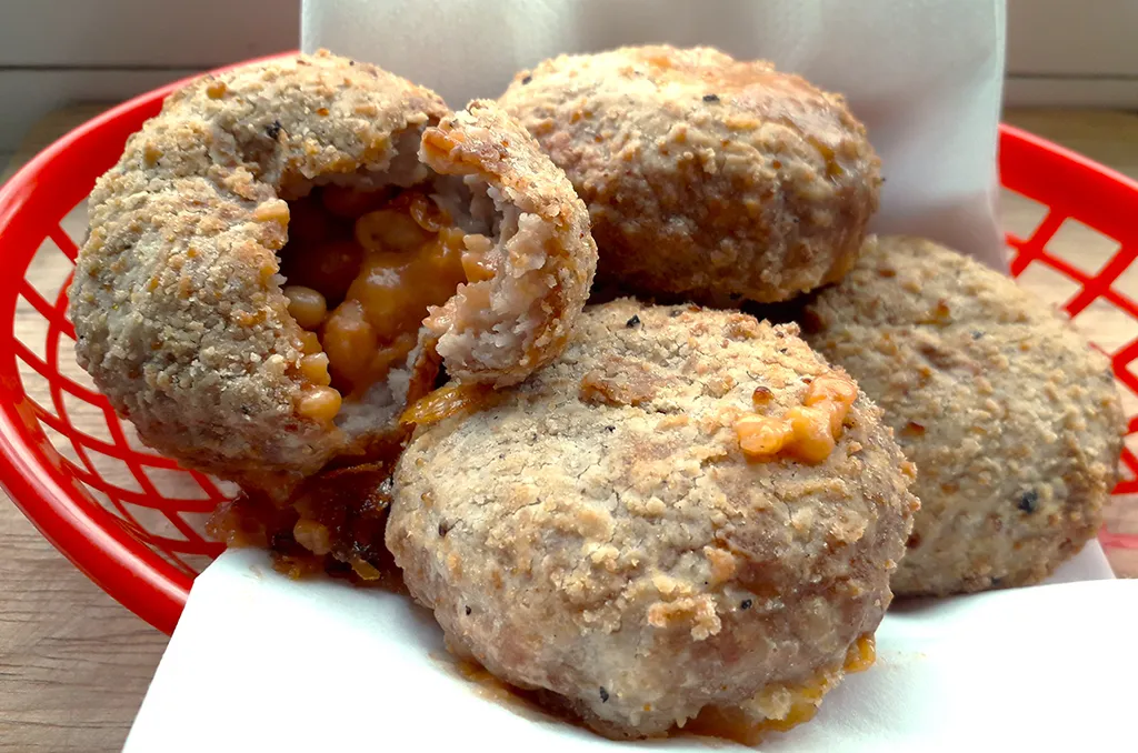 These cheesy bean bakes are made from a delicious blend of baked beans in a rich tomato sauce mixed with cheddar cheese, wrapped in pork sausage meat, coated in a light batter and a salt and pepper coating – ready to bake in the oven for a delicious treat.
